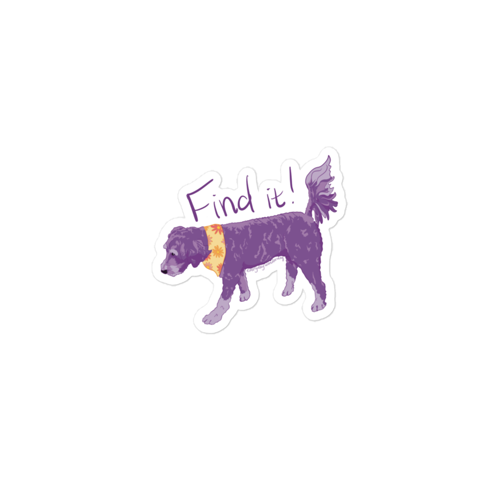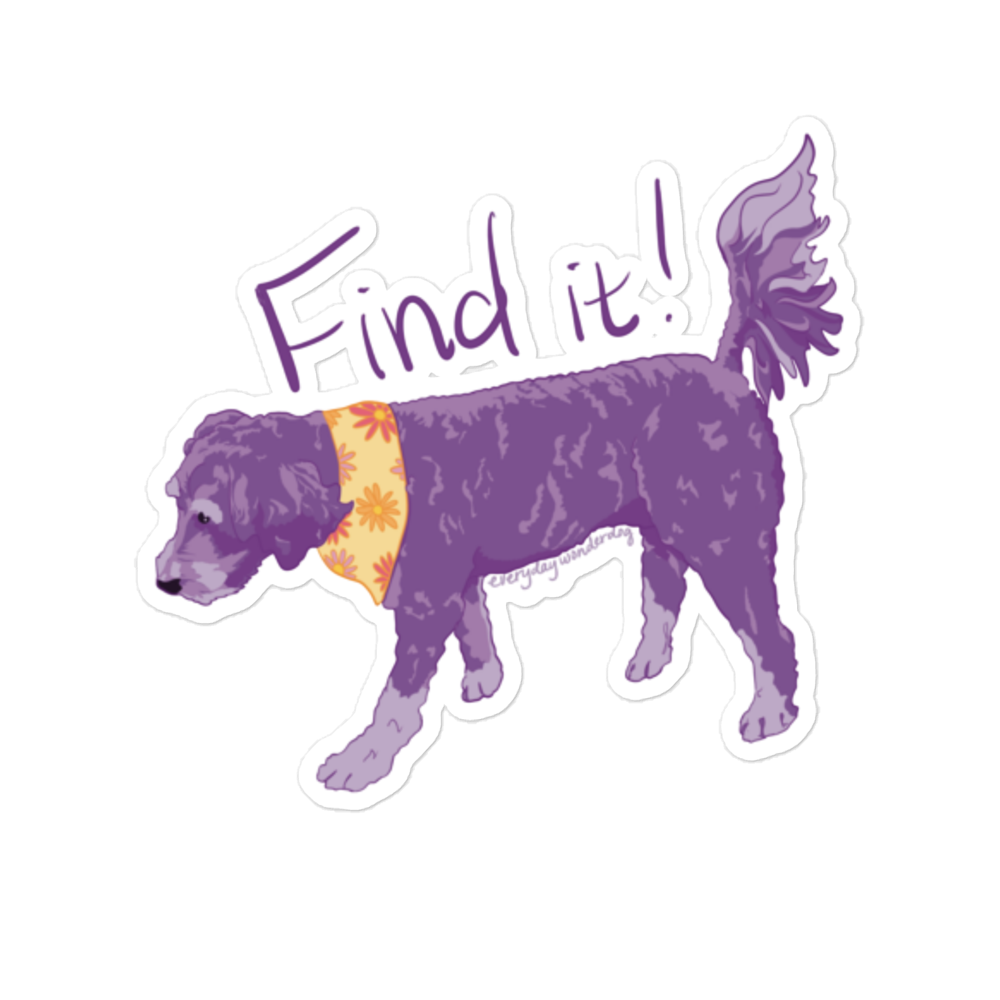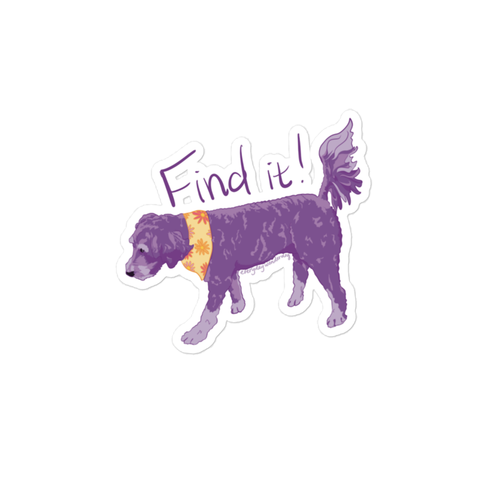 Showcase your love for Nosework with this 'Find it!' sticker featuring Daisy the Bernedoodle! I enjoy creating these portraits of my students in my free time, and each design takes approximately 5 hours to draw. This purchase shows your support for authentic, human-created art in a time when AI art is everywhere - thank you for supporting my art and small business!