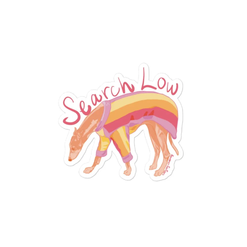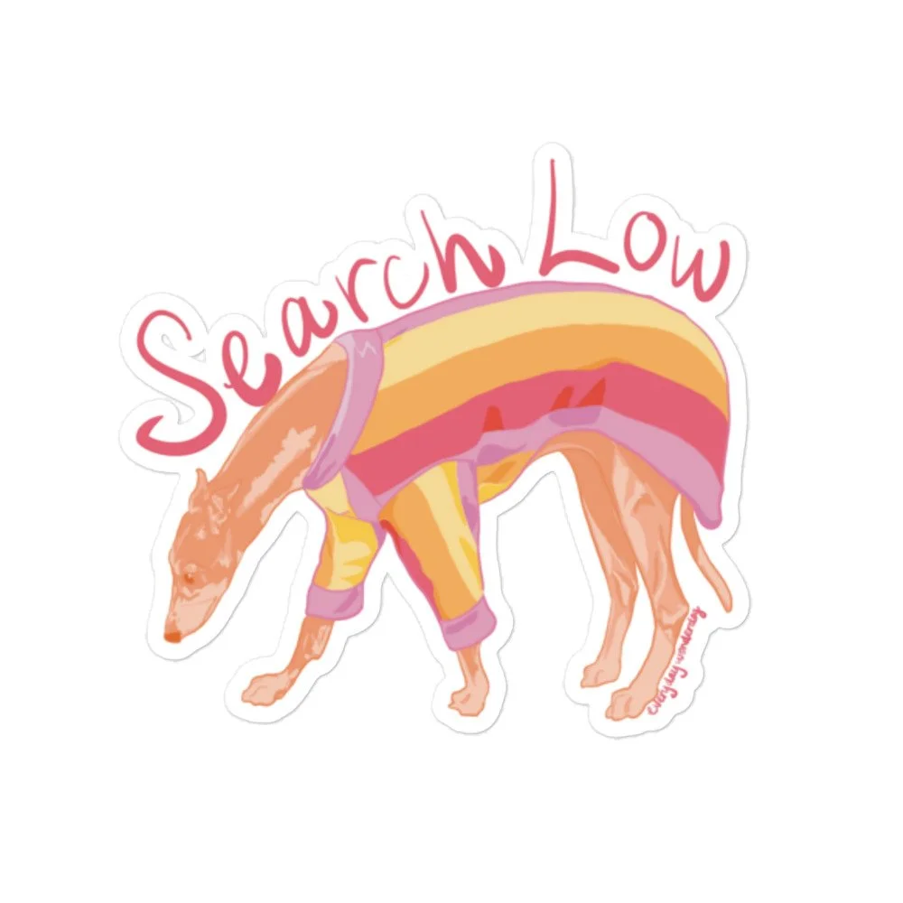 Showcase your love for Nosework with this 'Search Low' sticker featuring Pumpkin the Greyhound! I enjoy creating these portraits of my students in my free time, and each design takes approximately 5 hours to draw. This purchase shows your support for authentic, human-created art in a time when AI art is everywhere - thank you for supporting my art and small business!